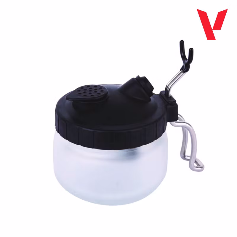 Glass cleaning station with airtight lid for gravity airbrush cleaning processes. The airbrush nozzle is inserted tightly into the lid opening, resting on its support, discharging and spraying the contents of the airbrush cup (Airbrush Cleaner 71.099 or water). This discharge of impurities and cleaner passes into the cleaning station through a filter (the kit includes three filters) and is deposited at the bottom, requiring emptying from time to time. The system allows precise cleaning and paint changeover processes,keeping work areas clean and tidy, even in confined spaces.