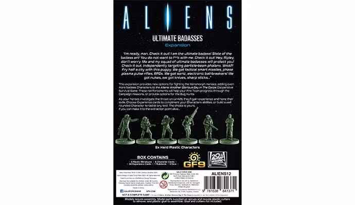 Expansion for Aliens: Another Glorious Day in the Corps, contains 6 Plastic Miniatures, 6 Character Cards, 64 Experience Cards, 1 Rulebook, 4 Dice.