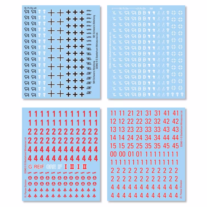 This German decal set covers the forces of the Deutsches Afrikakorps (DAK) and includes divisional insignias, tactical numbers and three different style of Balkenkreuz. It can be used for Early and Mid-War DAK forces.