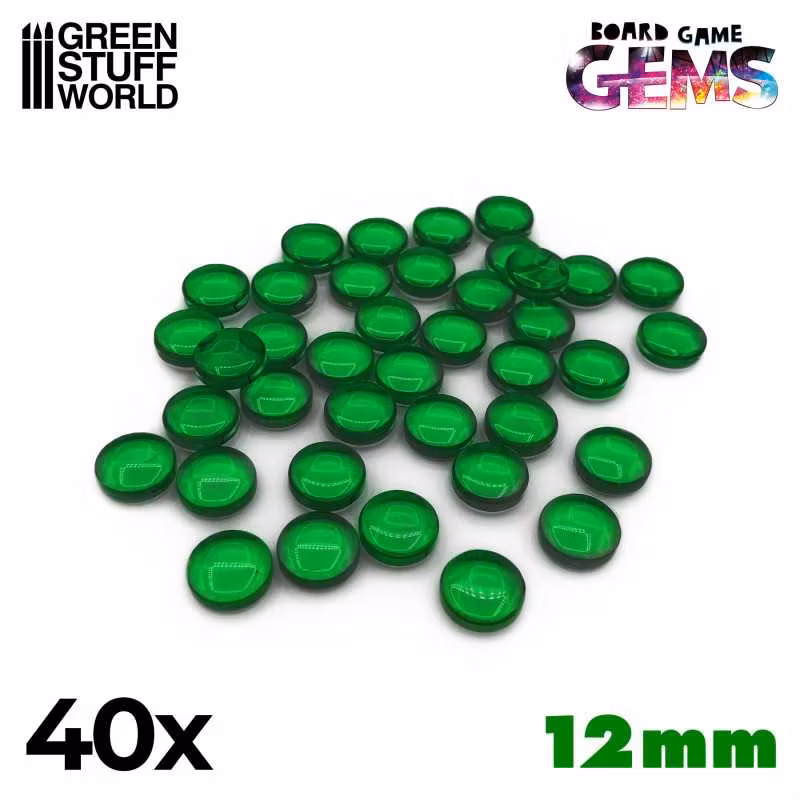 Transparent gems for Board Games made of transparent acrylic colored plastic. They have a polished finish. This serie of gems are at a size of 12 mm, and colored in red, yellow, light blue, turquoise or green.