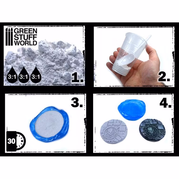 This unique special formula is the perfect product to be used with moulds. Its capacity for capturing high detail and the natural resilience of the pieces makes it ideal for creating scenic pieces for wargames, railway layouts, basing or dioramas. The pieces are easy to carve, sand, paint and glue once cured.