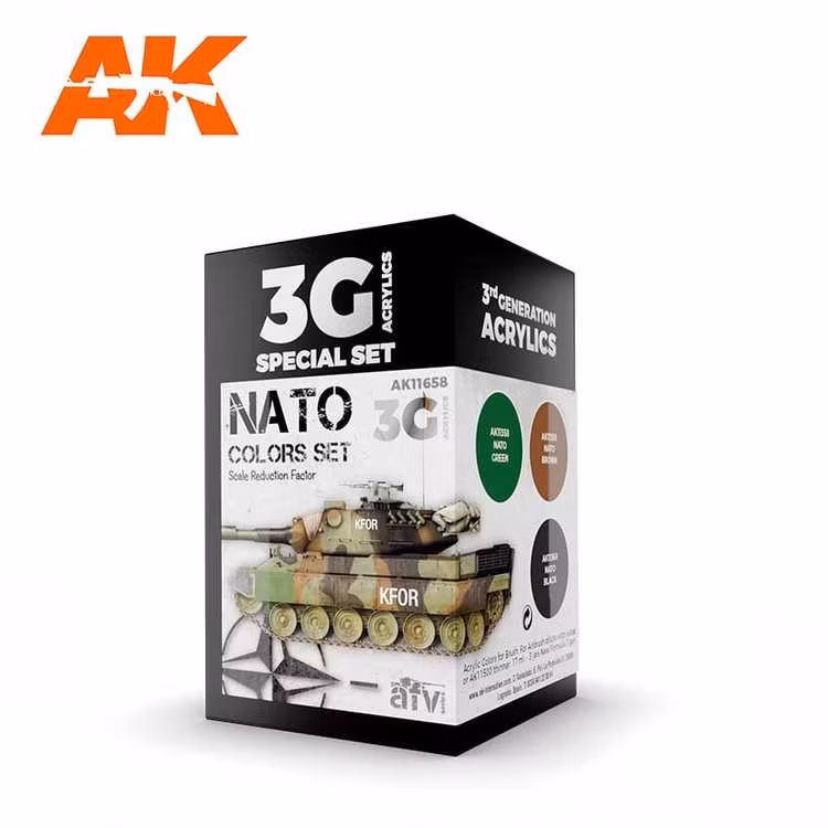 This 3rd Generation acrylic paint set contains the three standard colors used for painting military vehicles and equipment of the armies of most of the NATO member states from the second half of the 1980s.