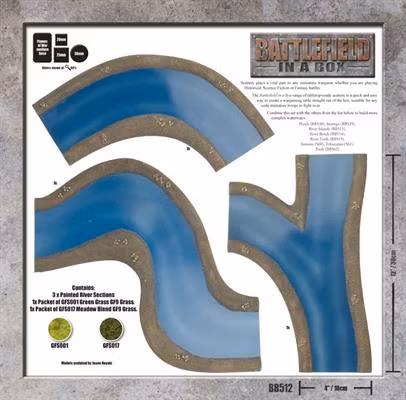 River Expansion: Fork contains three river sections; a river fork, a curved section and an S-curve section. Included with the pre-painted rivers is a small bag of Green Static Grass allowing you can flock the river banks to match your battlefield, or you may wish to use one of GF9’s many other Hobby Scenics to blend the piece in seamlessly with your own terrain collection and models. These pieces are cast in a flexible material to withstand the rigors of gaming.