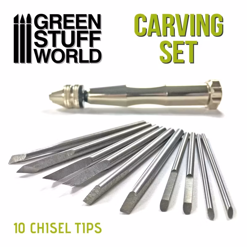 Chisel toolset including 10 precision tips made of tungsten high-speed steel valid for wood, soft metal, plastic and resin carving. The sturdy aluminium handle will allow you to easily swap out tips at your convenience.