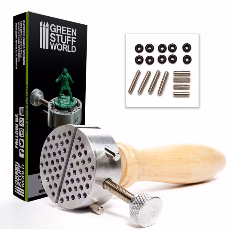 Universal work holder for easy handling of figurines, parts, accessories and other material. Essential for all modelers and sculptors.