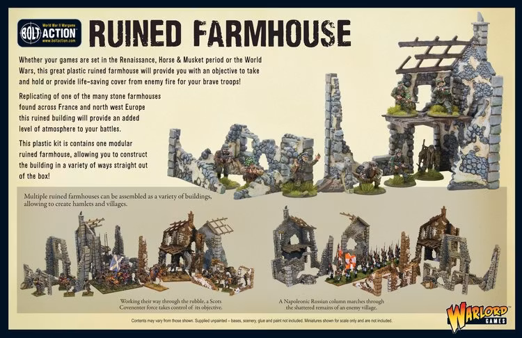 Nothing enhances a tabletop battle more than great-looking, evocative terrain. Whether your games are set in Renaissance, Horse & Musket period (1700 - 1900) or the World Wars, this great plastic ruined farmhouse will provide you with an objective to take and hold or provide life-saving cover from enemy fire for your brave troops.