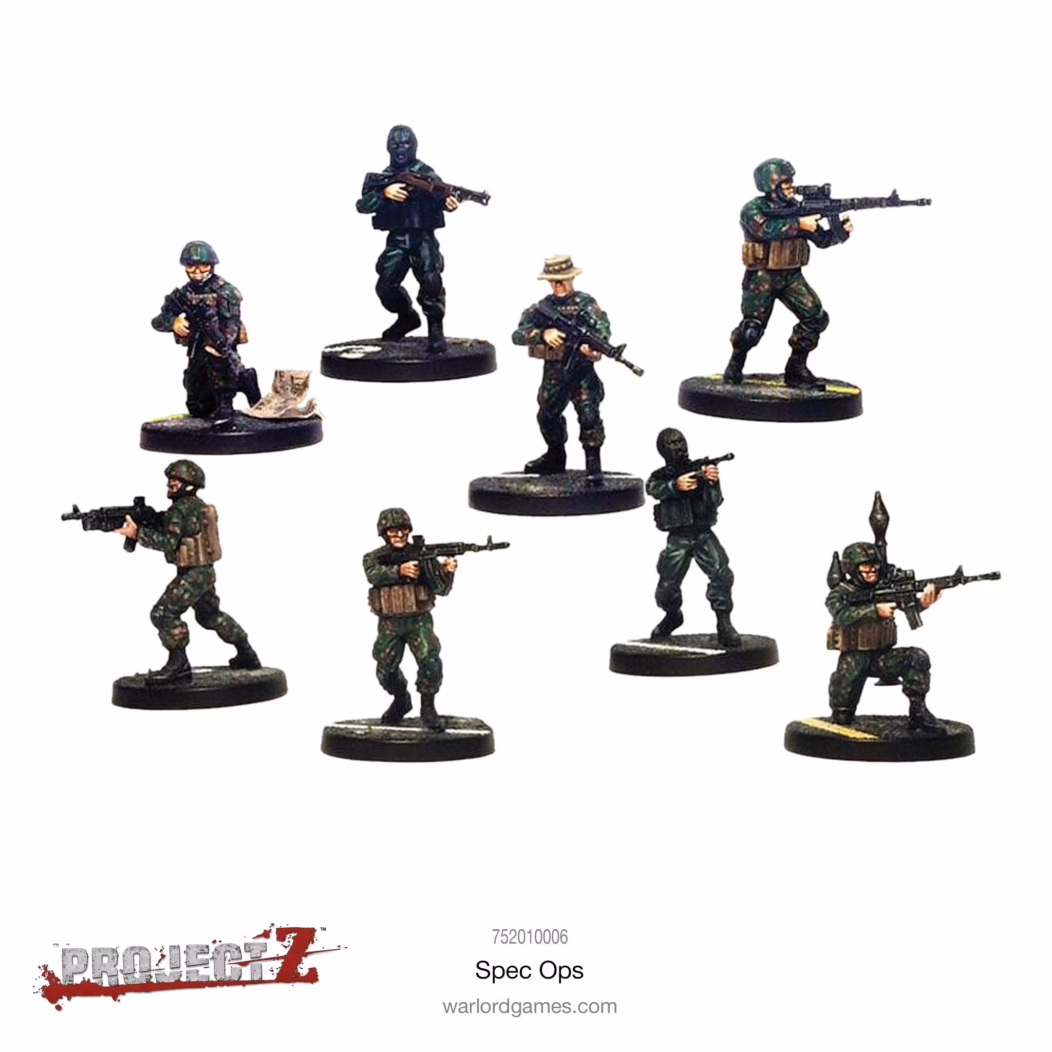 Box contains 8 plastic miniatures and 20 game cards, Spec Ops rules booklet, plastic bases and assembly leaflet.